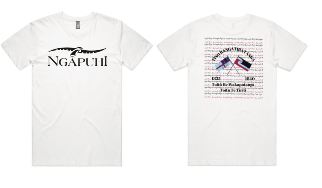 First up we have our 'Hīkoi mo te Tiriti' tee designed by Māori and owned by Iwi.